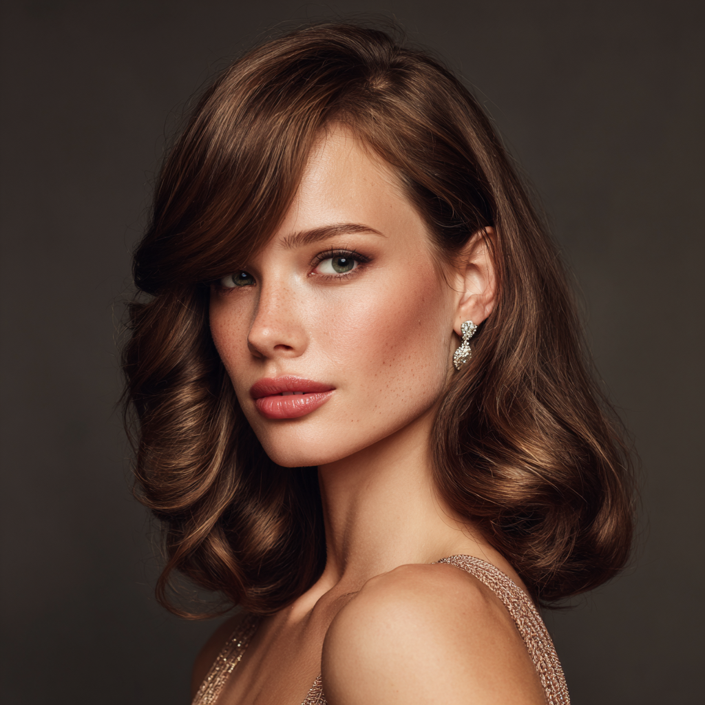 This medium-length elegant hairstyle with side-swept bangs is perfect for formal events or professional settings. The soft waves add polish while the bangs enhance facial symmetry.