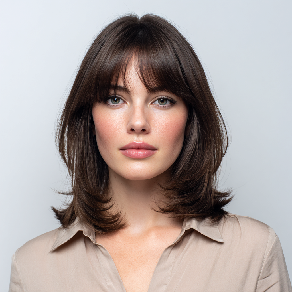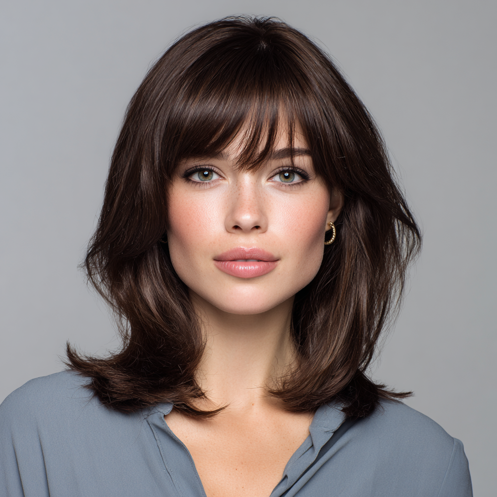 Medium-length hair with face-framing bangs softens facial features and adds dimension to layered hair. The bangs gently curve around the cheeks for a flattering effect.