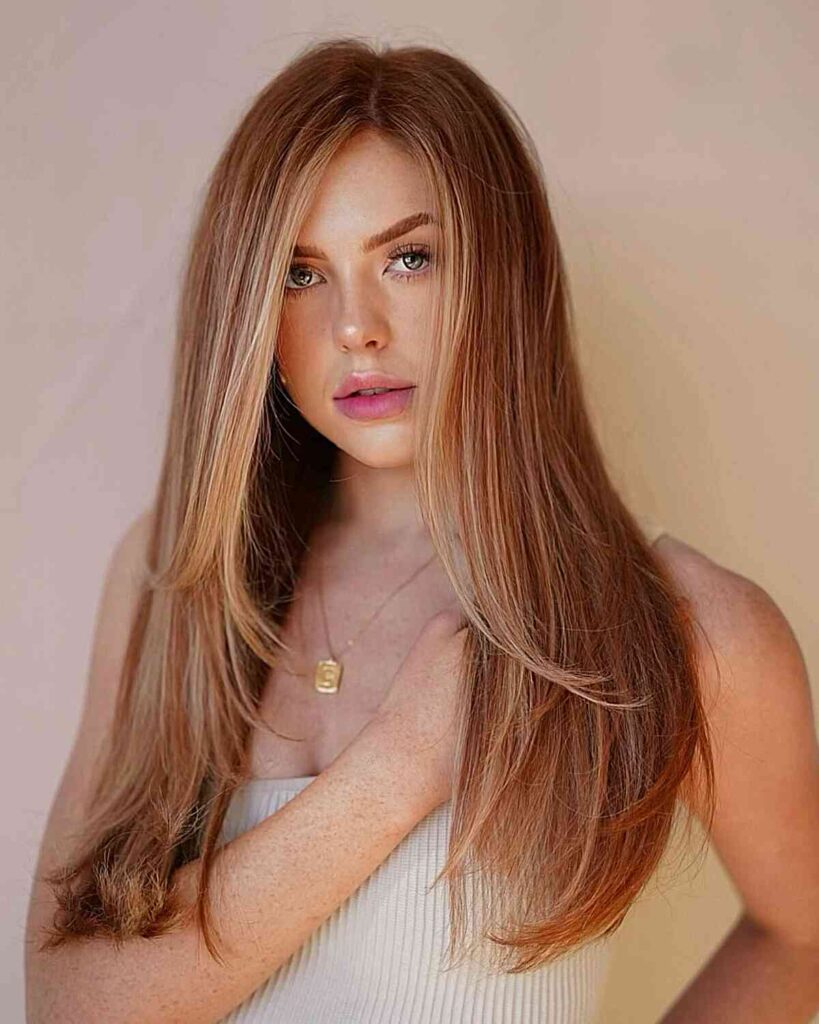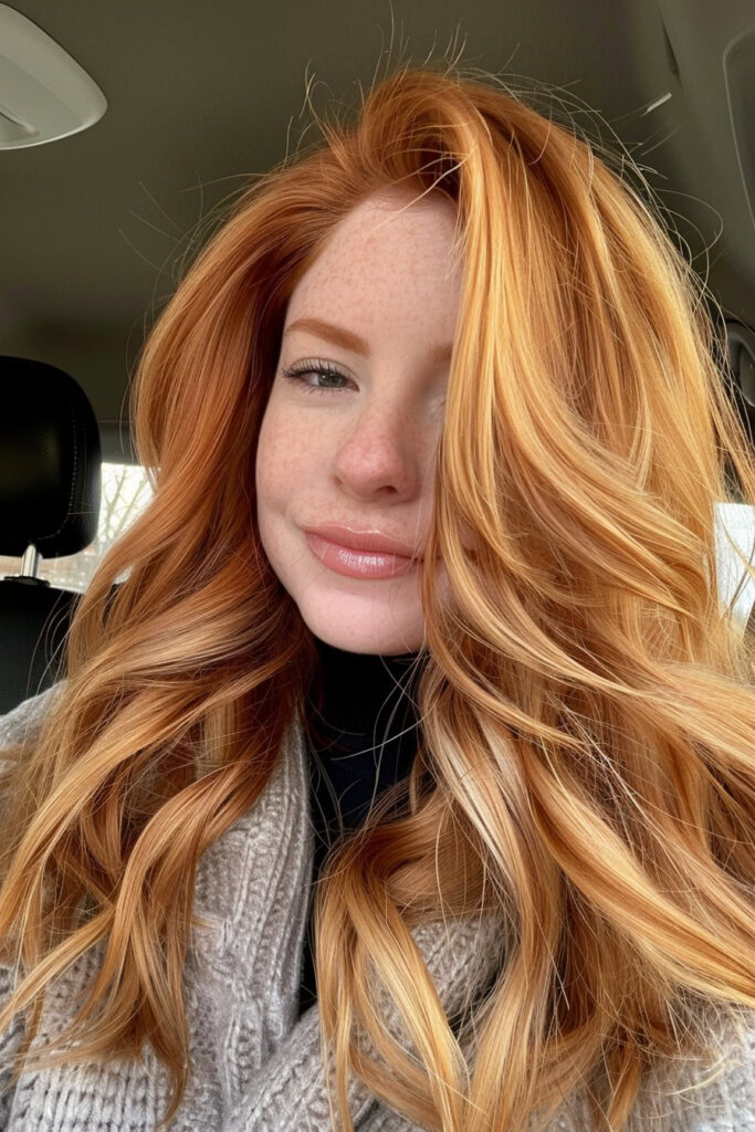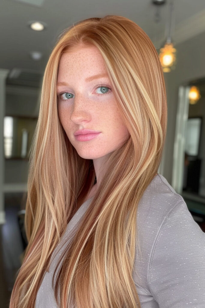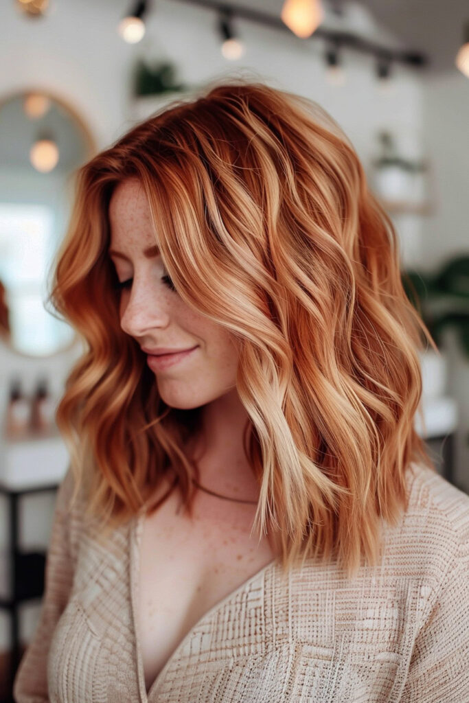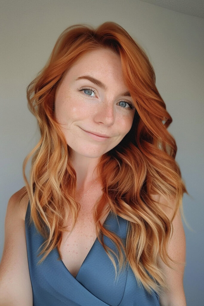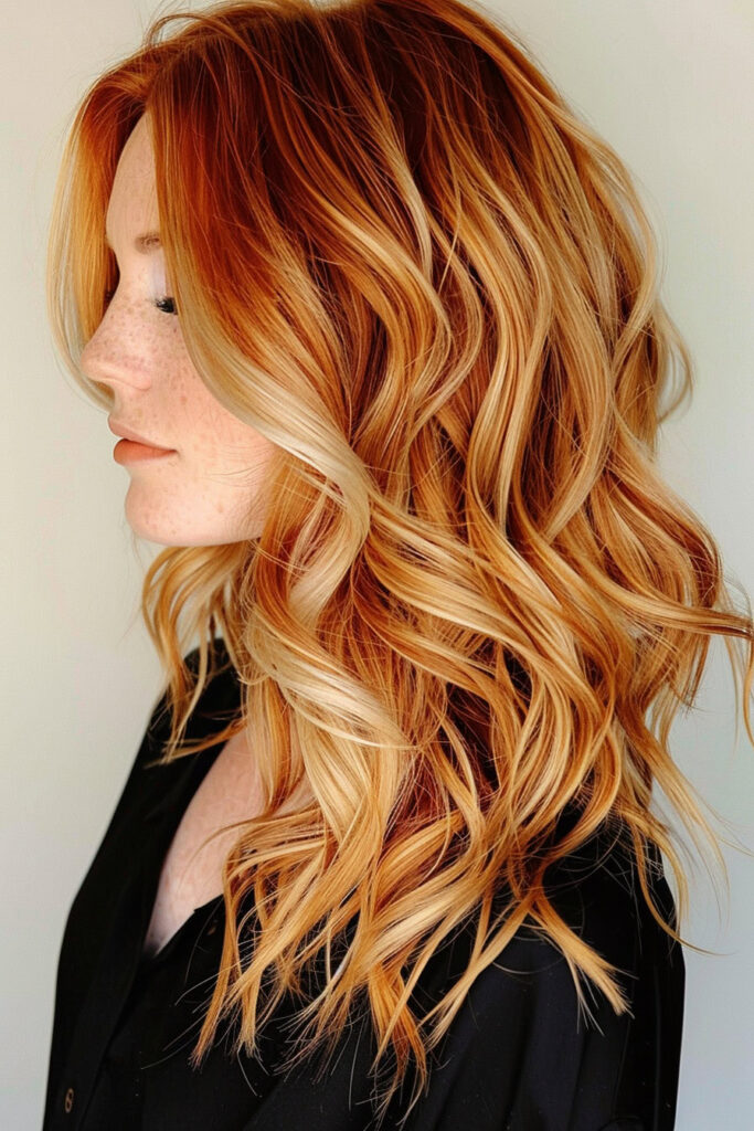 This style mixes a natural ginger base with golden blonde balayage highlights, giving hair a sunkissed, radiant effect. The blend looks effortless, warm, and natural—like a perfect summer glow.