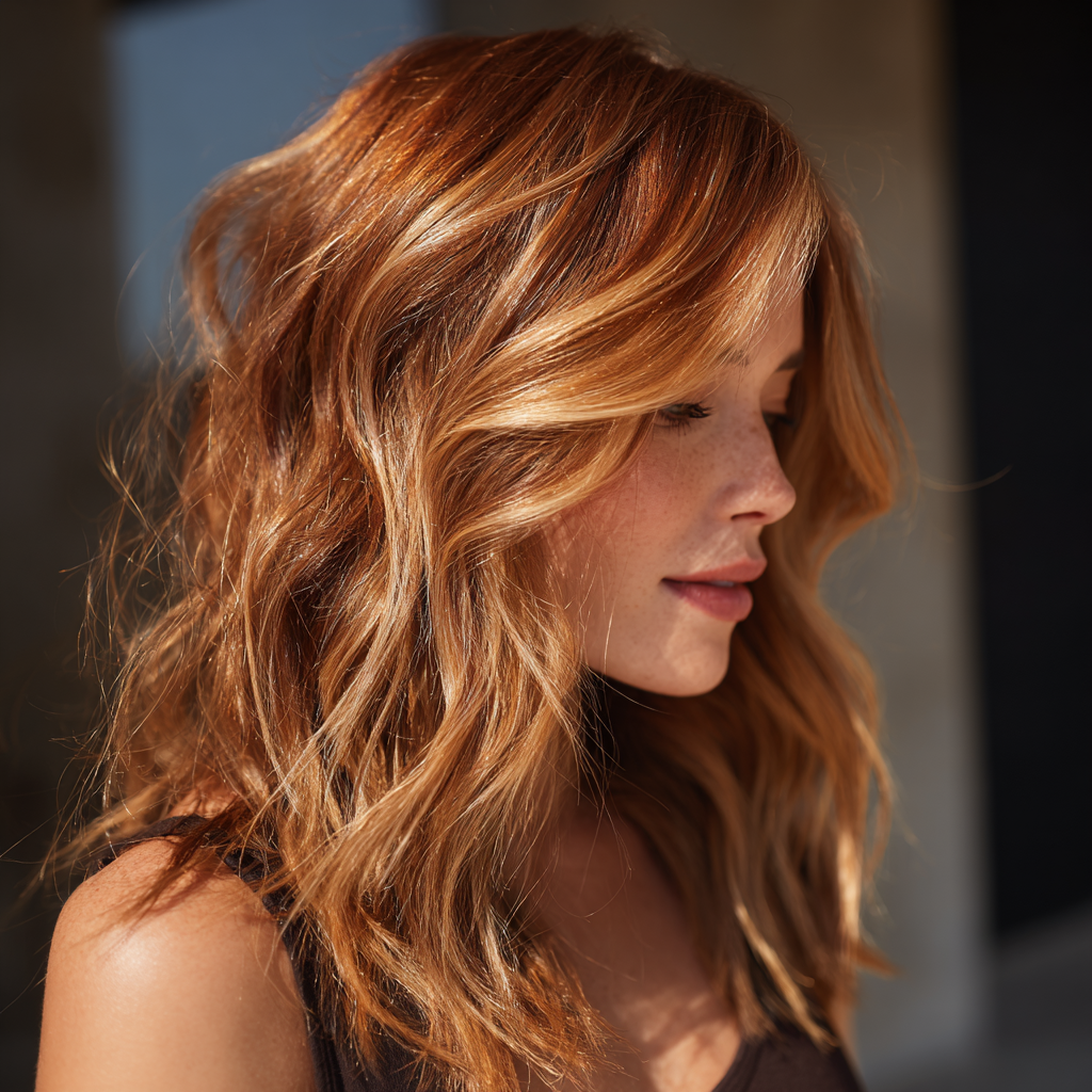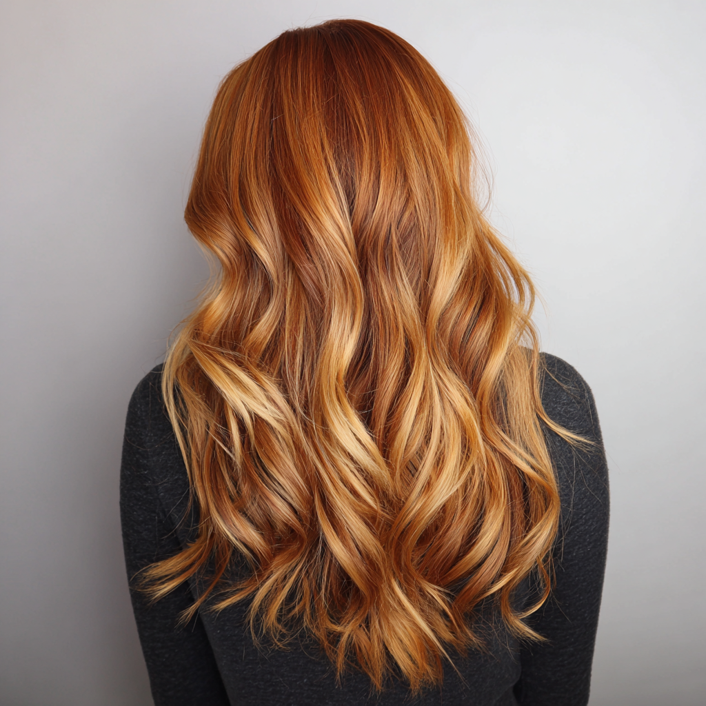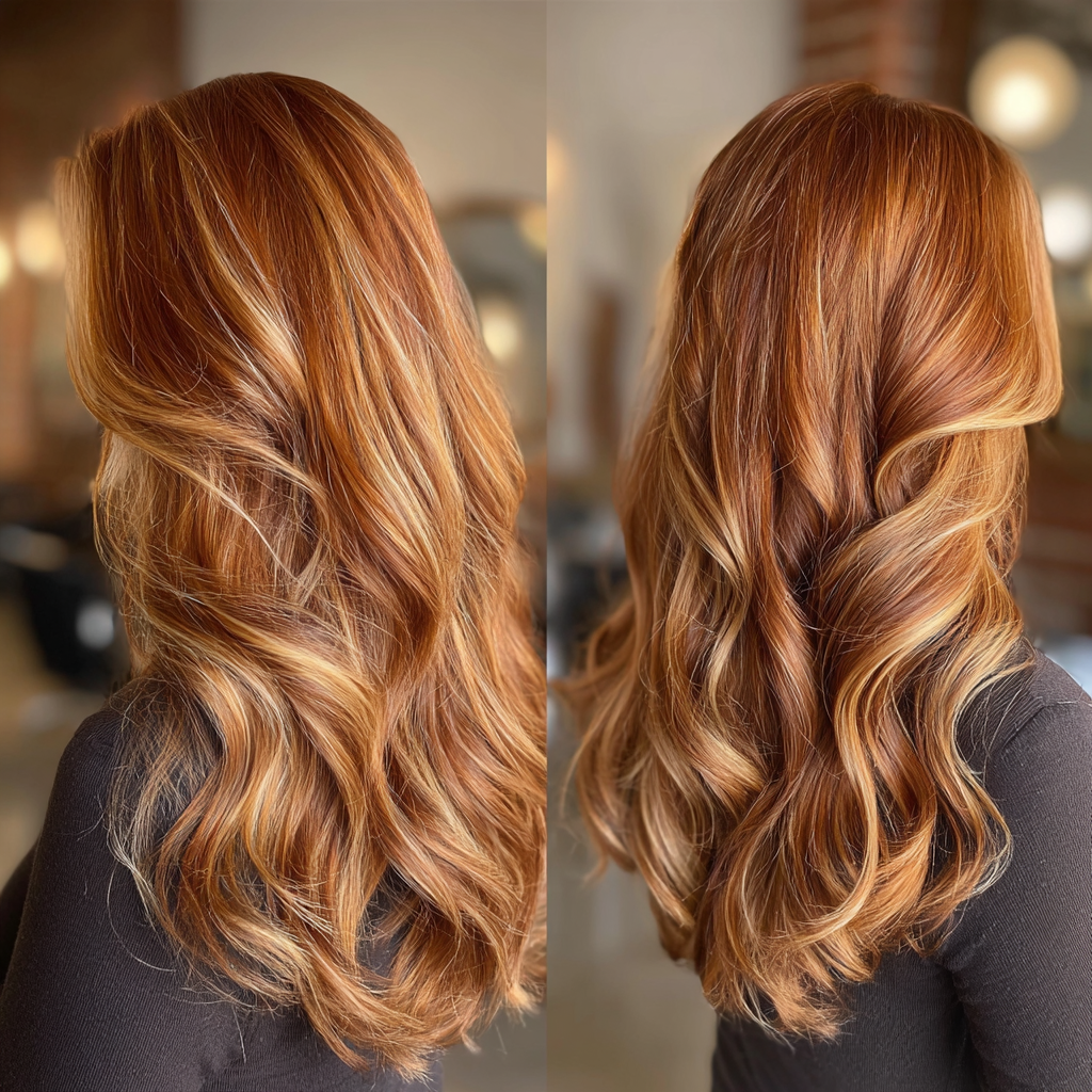 This look brings energy and brightness to red hair with a perfect mix of copper, strawberry, and blonde tones. The multidimensional layering creates a lively, light-reflecting finish that catches the eye from every angle. It’s perfect for those who want their hair to look full of movement and depth.