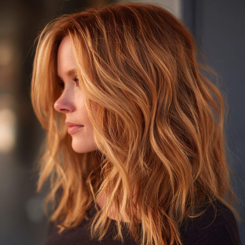 This soft, dimensional color mix adds richness and natural depth to red hair. The auburn lowlights deepen the tone, while blonde highlights illuminate the strands, creating a sun-kissed finish. It’s elegant, timeless, and ideal for medium-length haircuts like layered lobs or wavy shags.