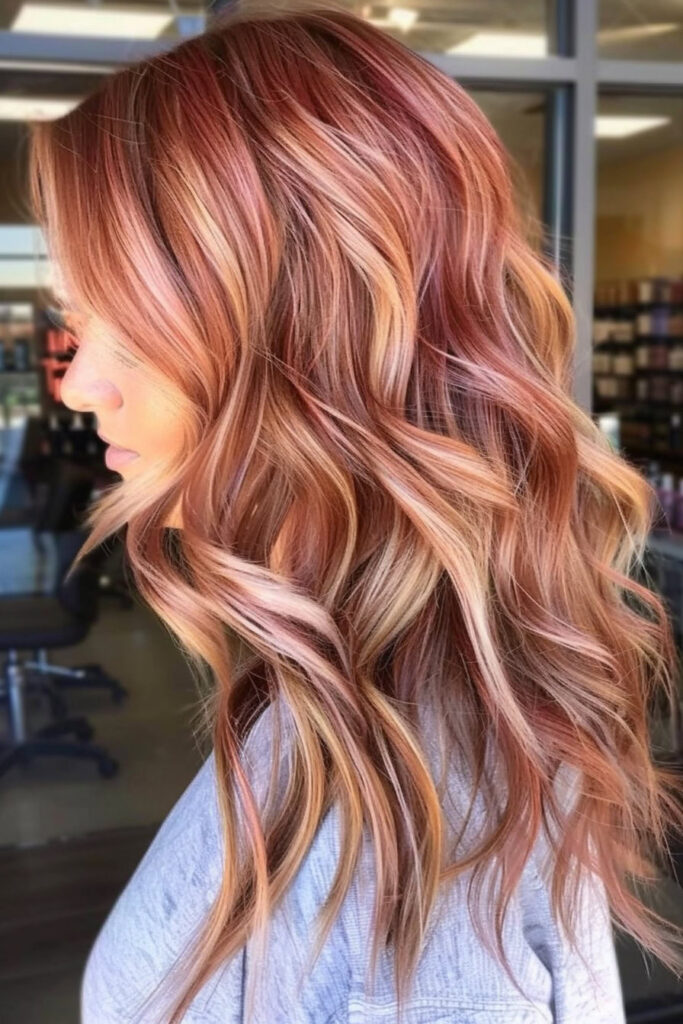 This dreamy combination brings together pinkish-red tones with rose gold and honey blonde highlights, creating a luminous, romantic finish. The soft shimmer of rose gold makes the hair look radiant and trendy without being too flashy.