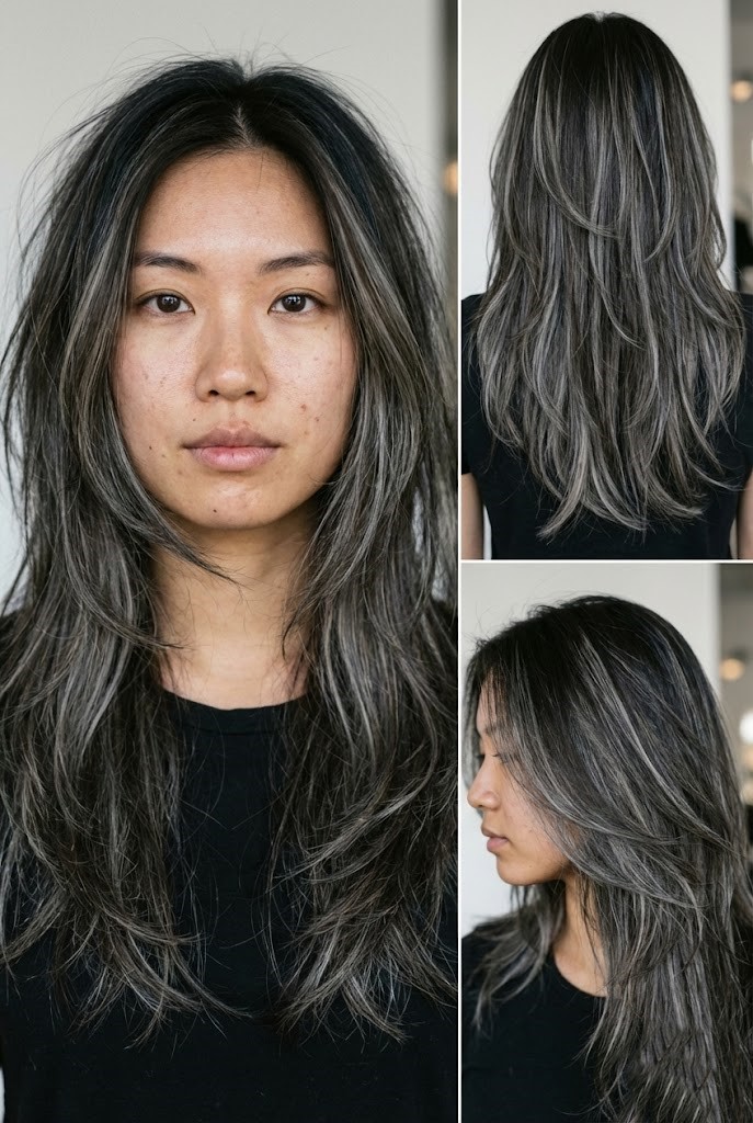 Ash-gray highlights pair beautifully with layered cuts, adding shape and airy dimension. The cool tones enhance movement and give the layers a soft, flowing look.