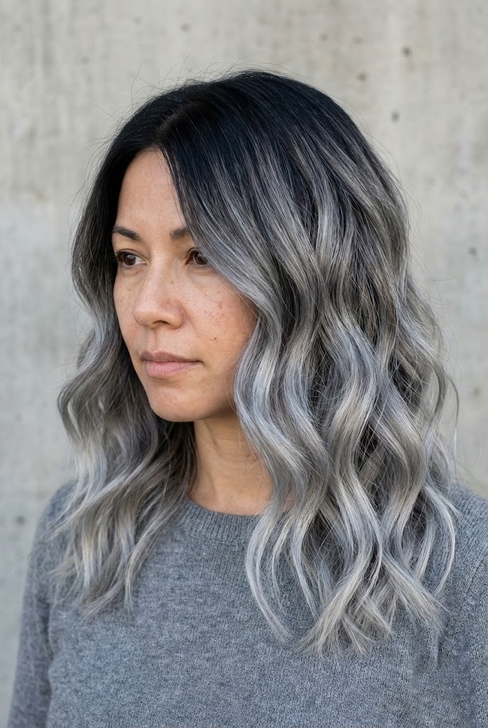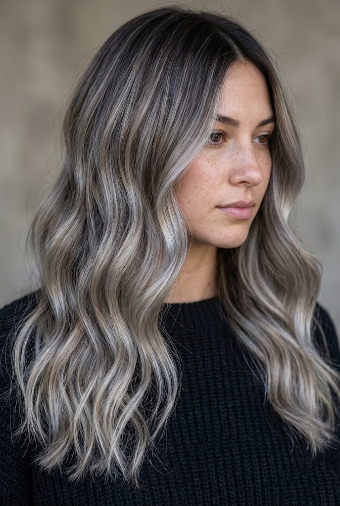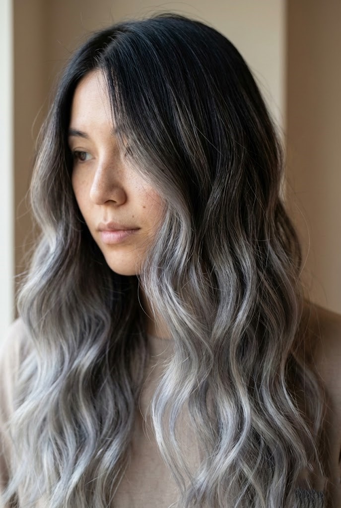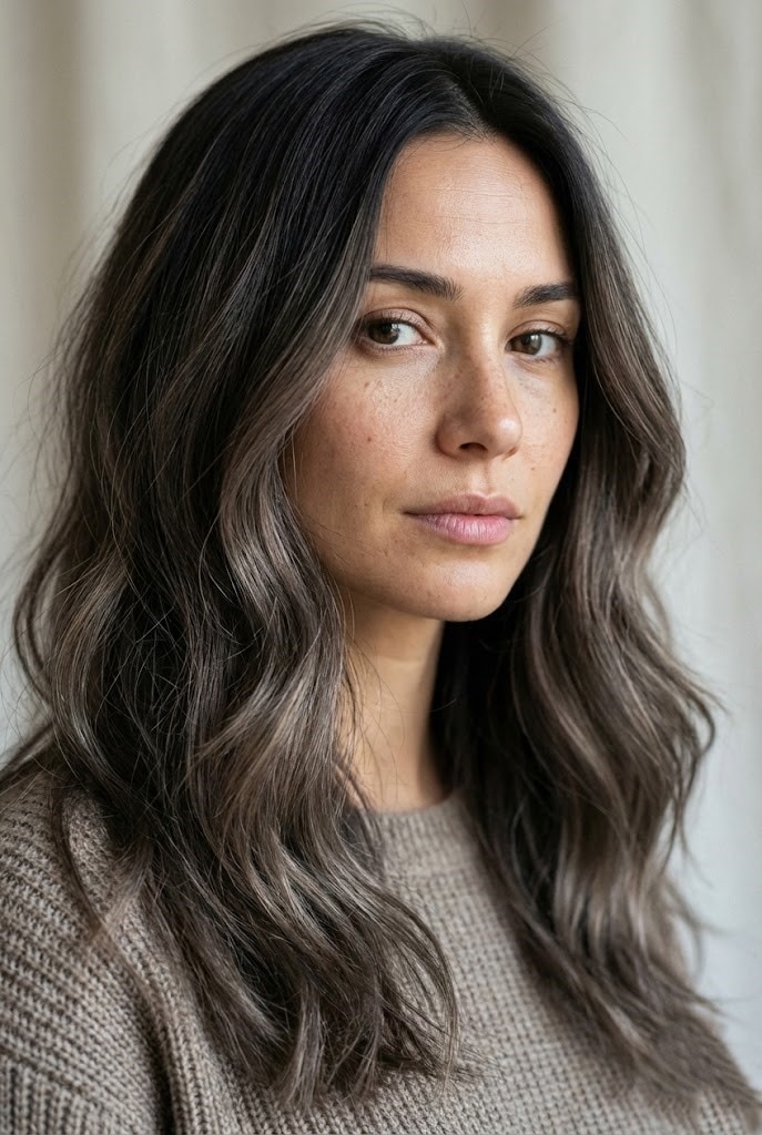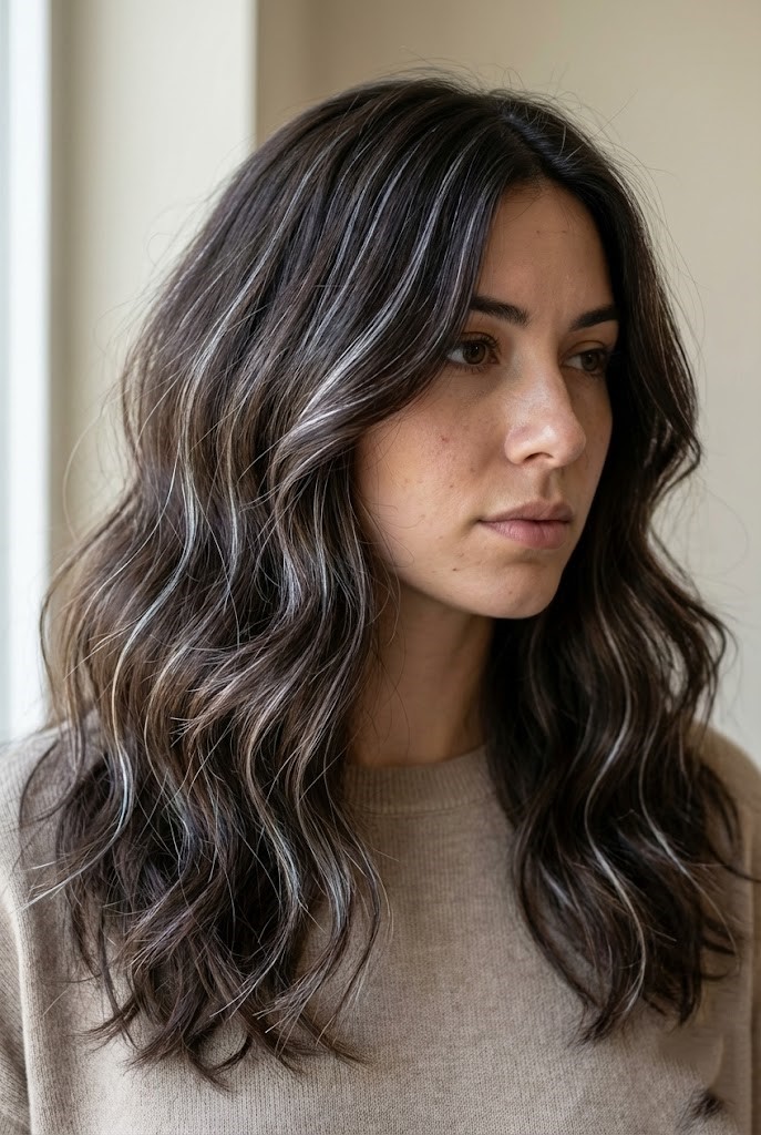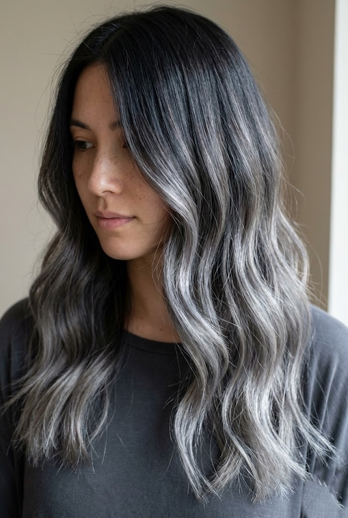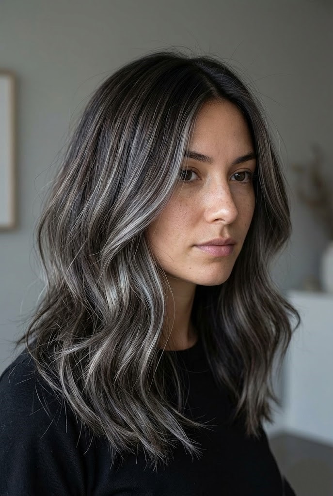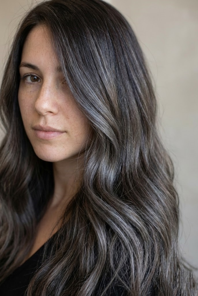 Gray-smoked highlights add a cool haze over dark wavy hair, enhancing texture and movement. The smoky tones create a soft, diffused finish that feels effortless.