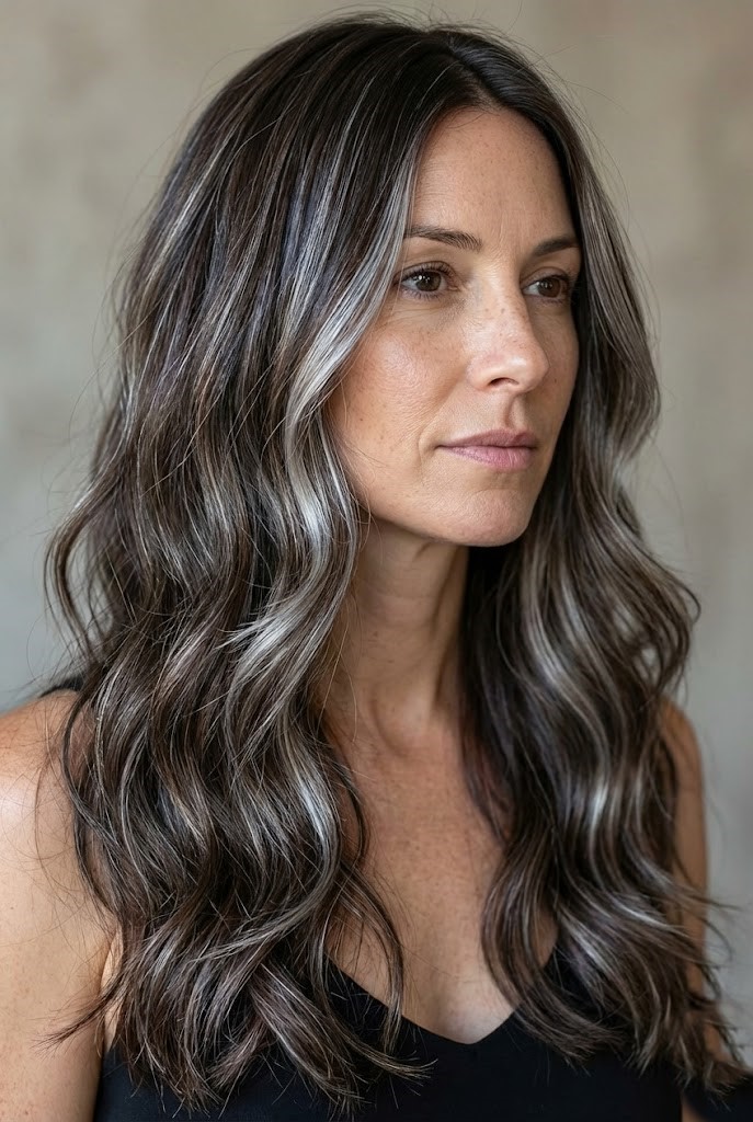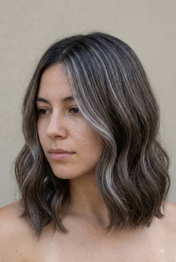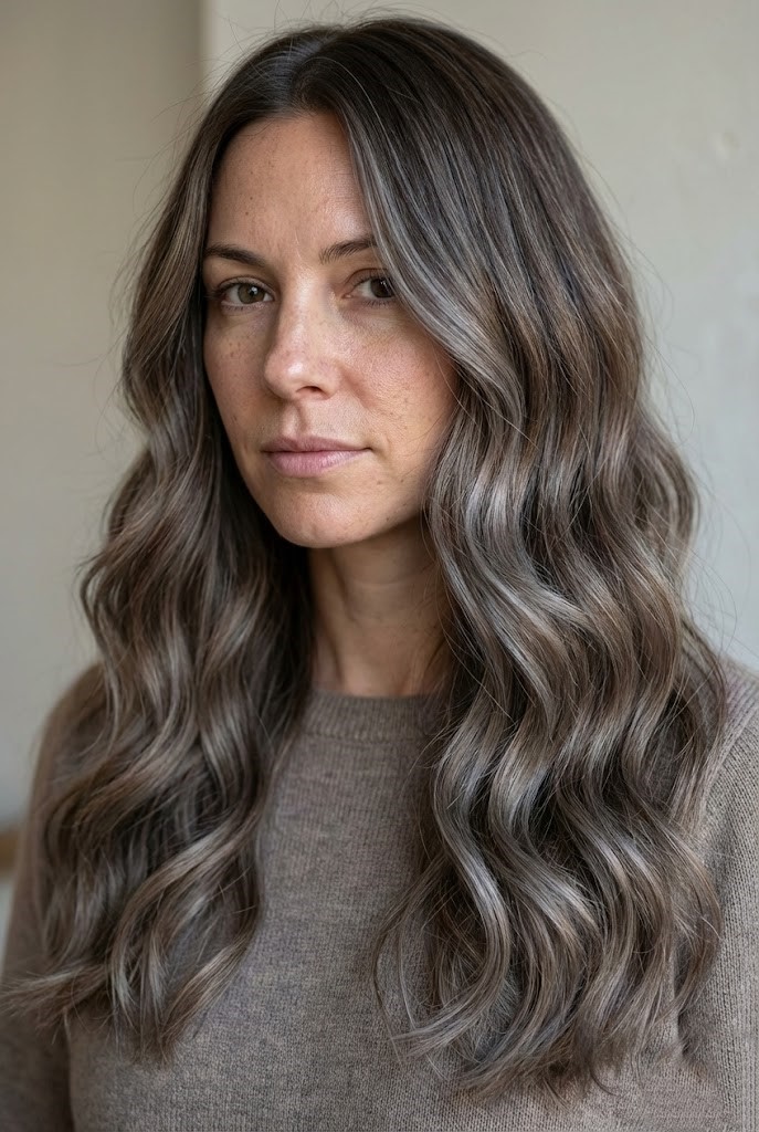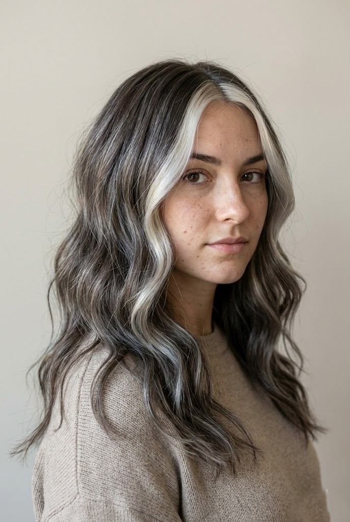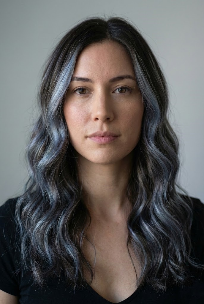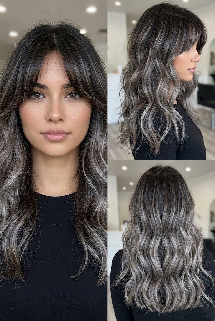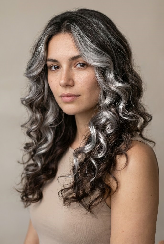 Gray-smoked highlights add a cool haze over dark wavy hair, enhancing texture and movement. The smoky tones create a soft, diffused finish that feels effortless.