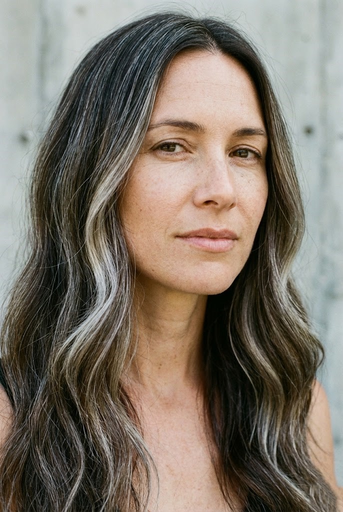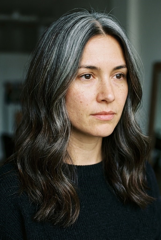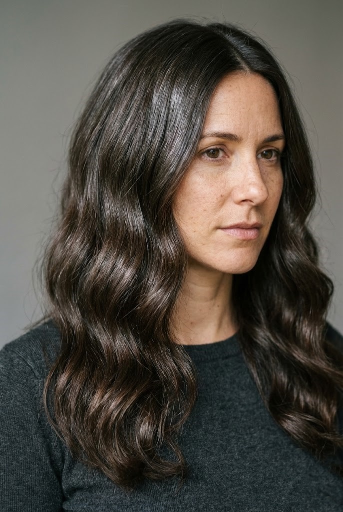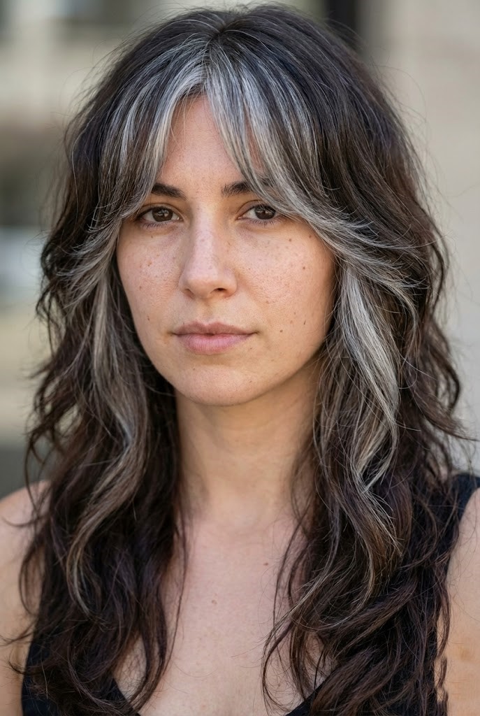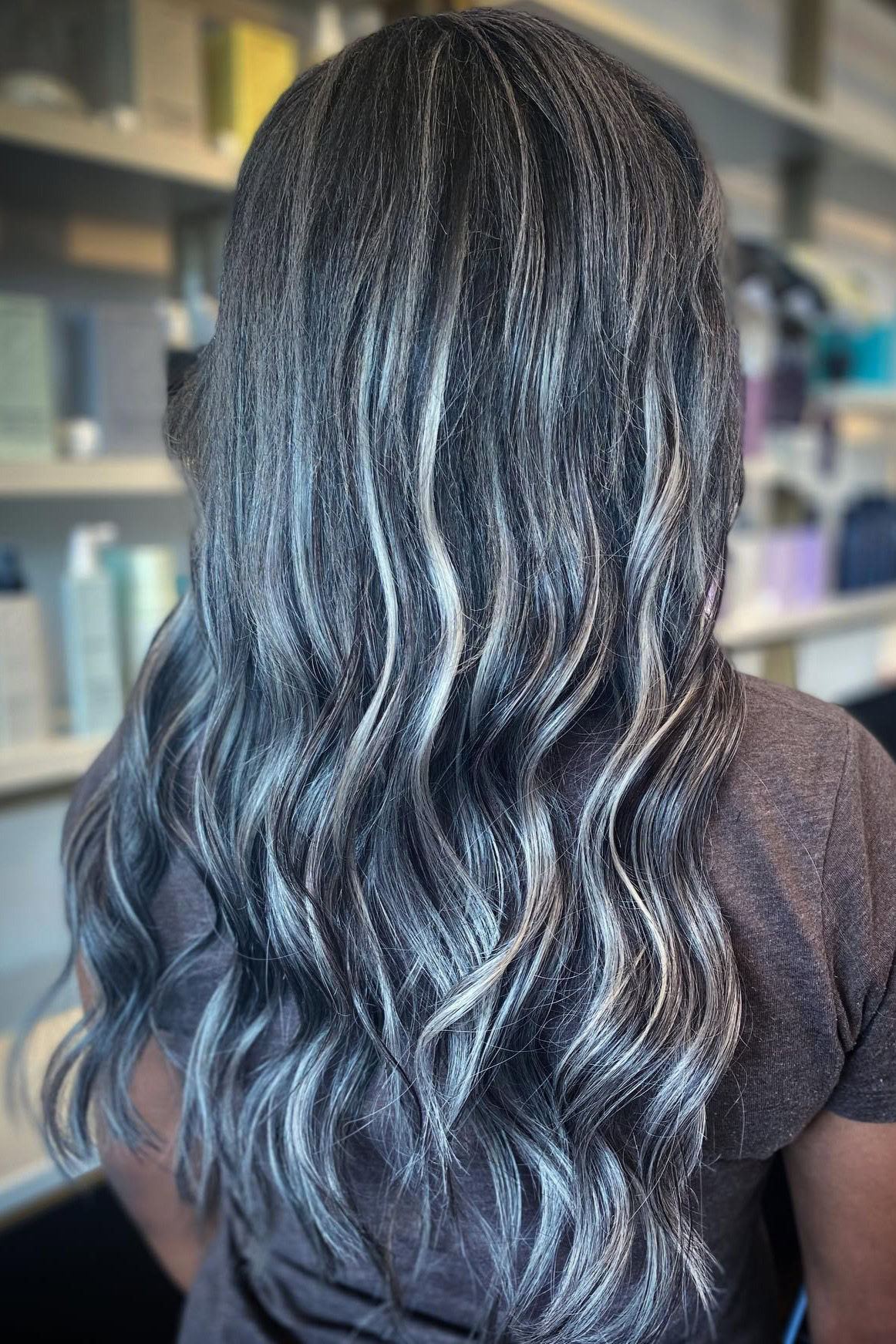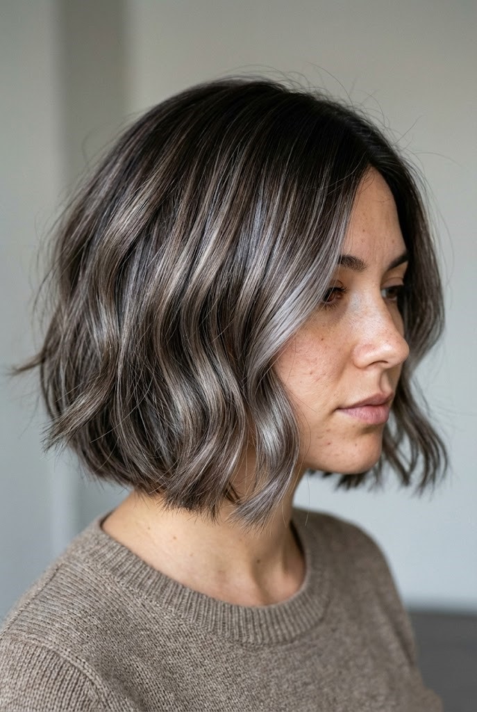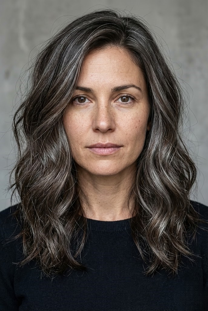 Gray-smoked highlights add a cool haze over dark wavy hair, enhancing texture and movement. The smoky tones create a soft, diffused finish that feels effortless.