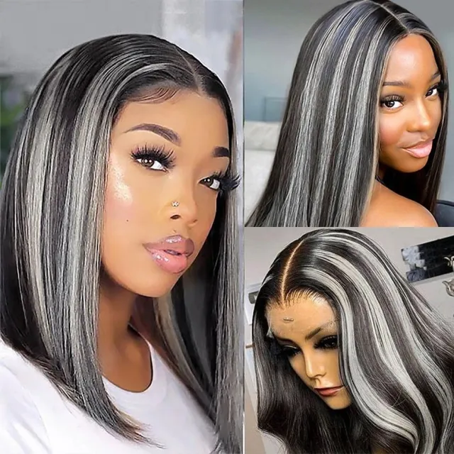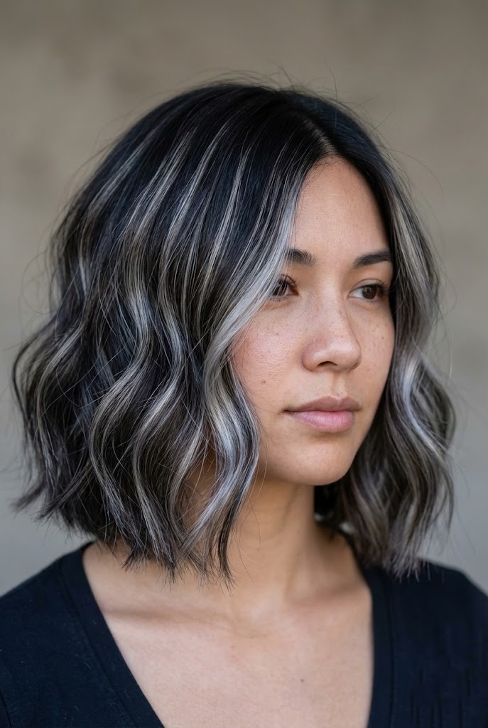 Silver balayage looks striking on a dark bob, giving the shorter cut bold definition and shine. The hand-painted placement adds depth without looking too heavy.