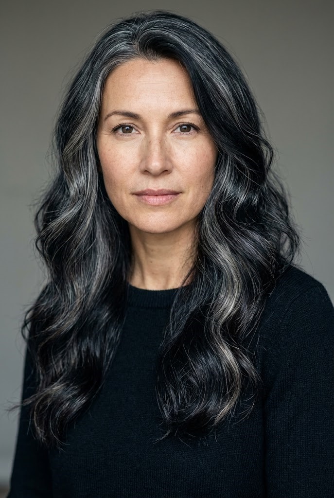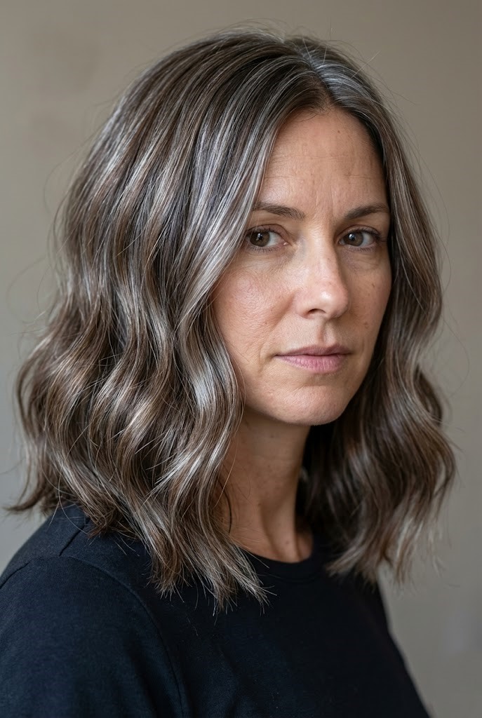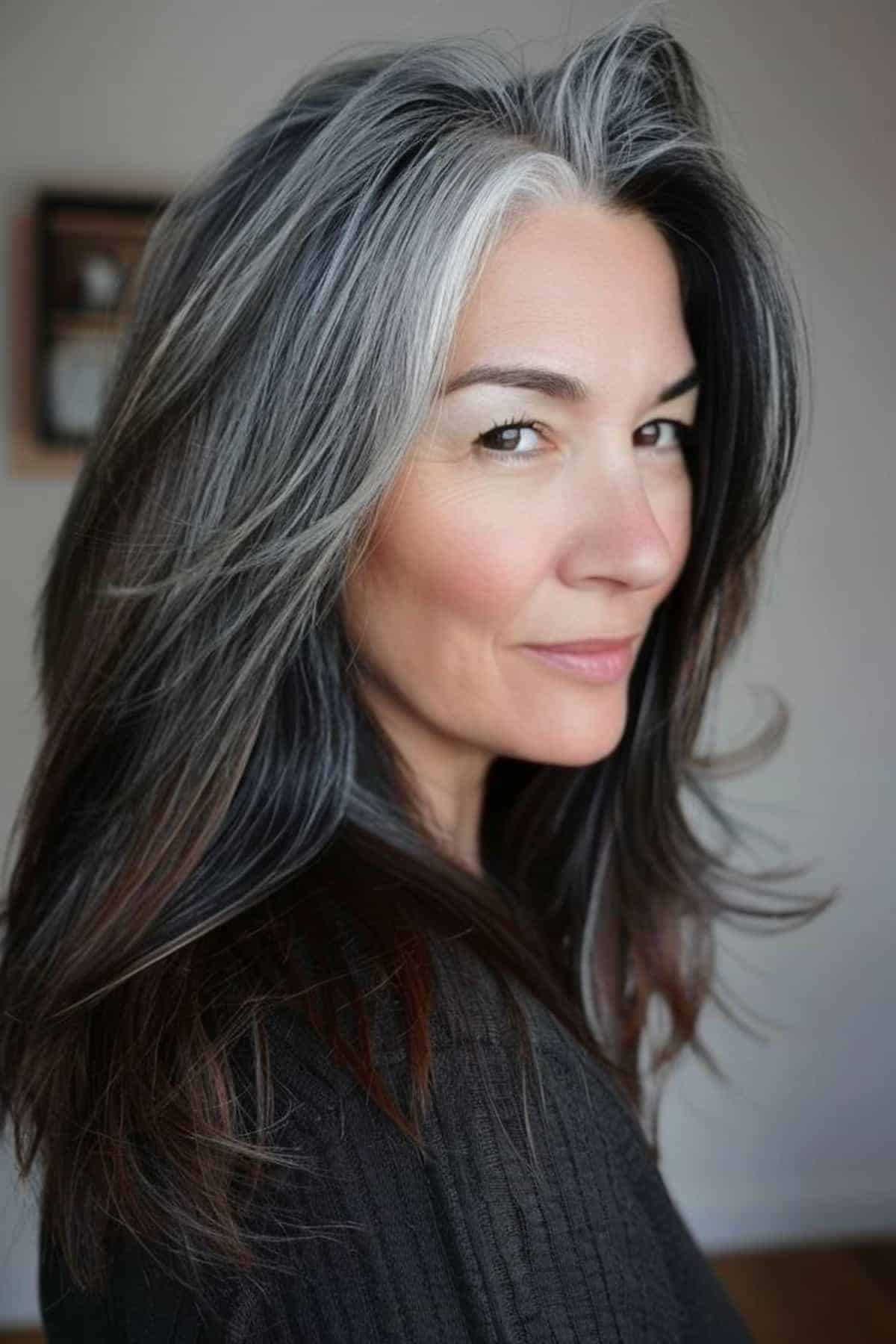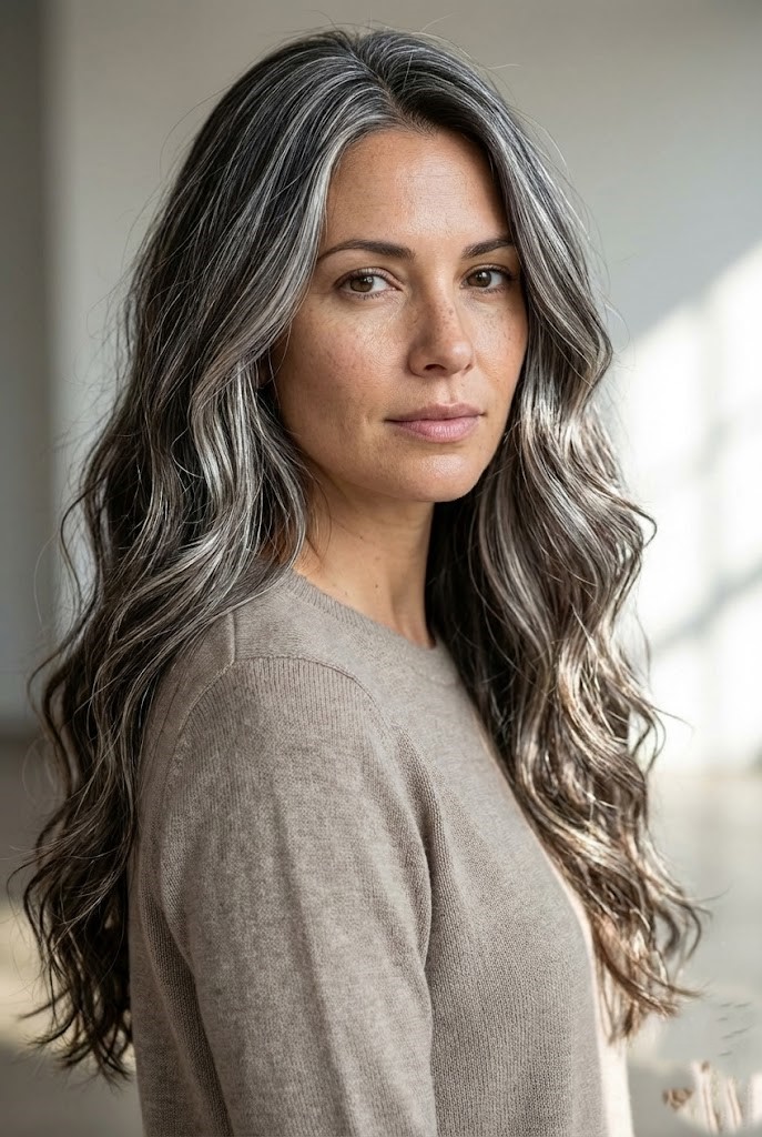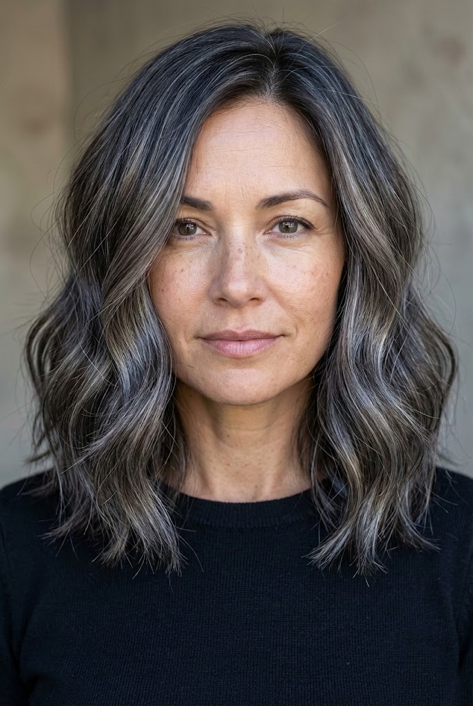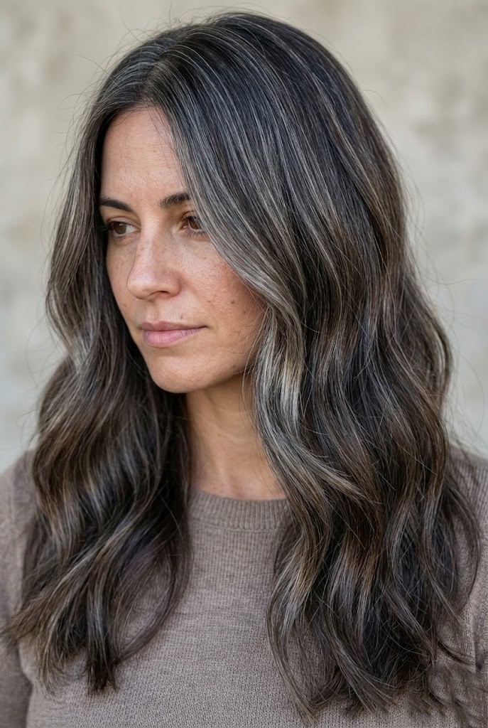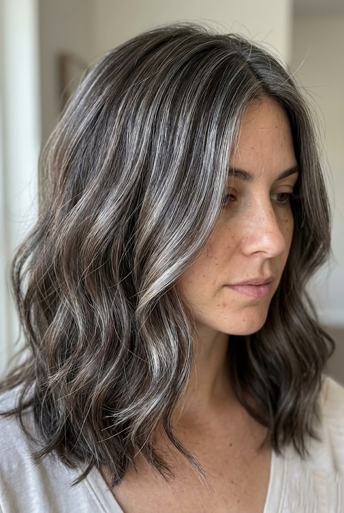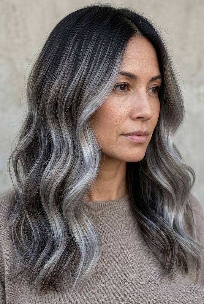 This style offers richness without harsh contrast. The blend of charcoal and silver tones gives the hair a soft, diffused flow.
