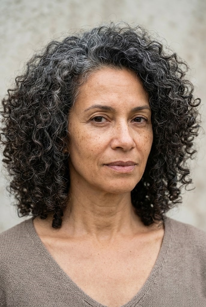 Gray blending for dark curly hair enhances natural curls with soft silver accents. The highlights catch the light and add definition to each curl pattern.