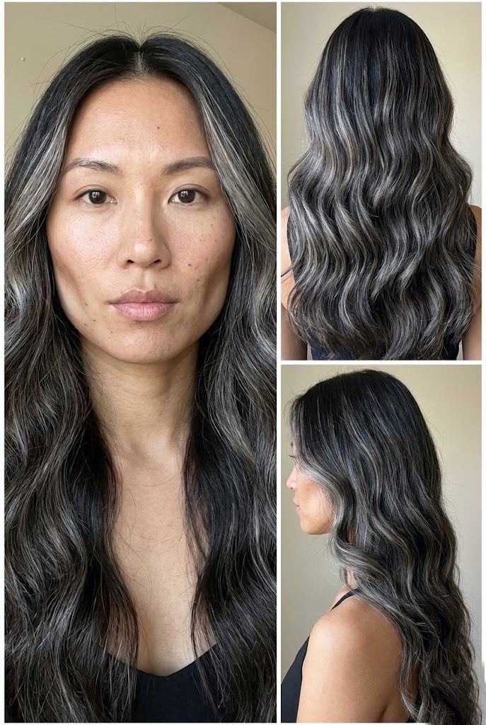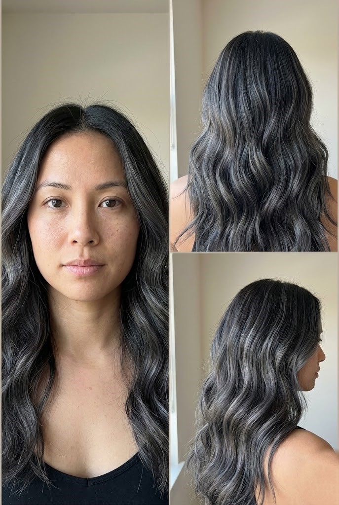 Ash-silver balayage softens the richness of black hair and brings in cool, metallic dimension. The blended effect gives a smooth transition from dark roots to icy ends.