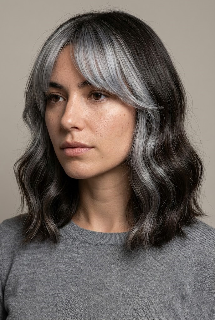 A silver money piece instantly brightens the face and adds a bold, modern touch to dark hair. The contrast draws attention to your features in a flattering way.