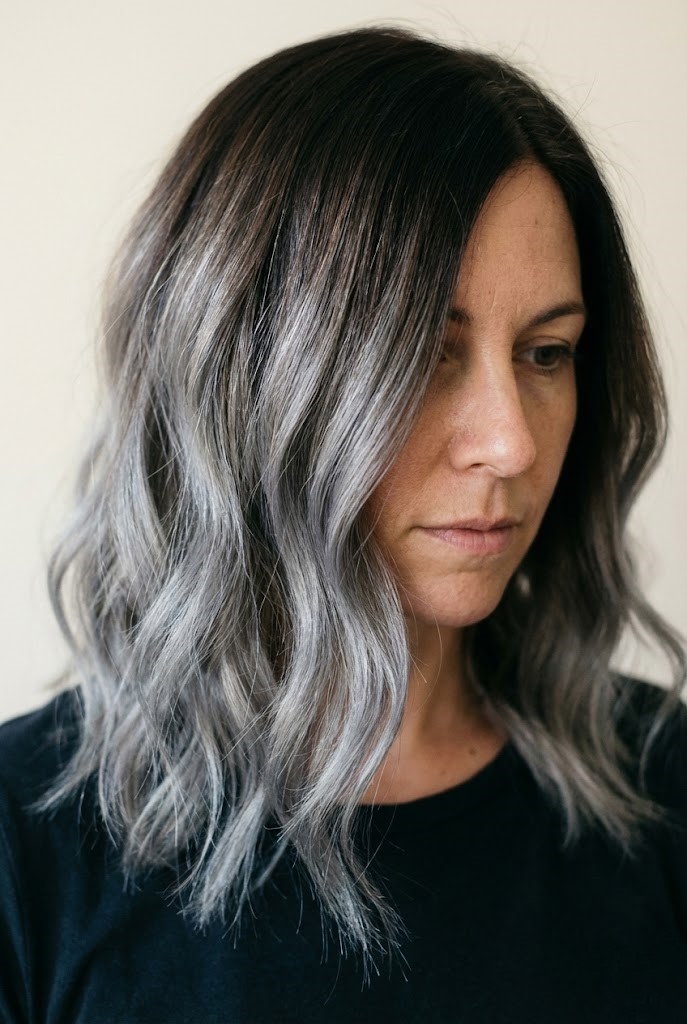 This style works great for medium to long hair. The gray accents brighten the ends and make the layers pop.