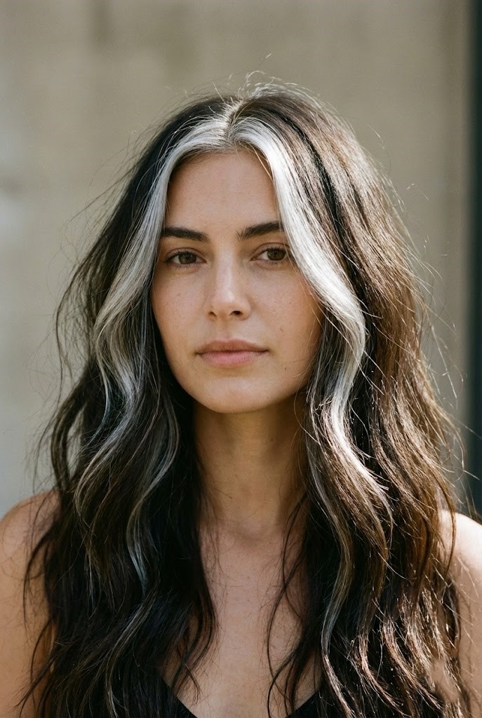 High-contrast silver streaks make a bold statement against dark roots and lengths. The sharp difference between tones gives your hair a dramatic, eye-catching style.