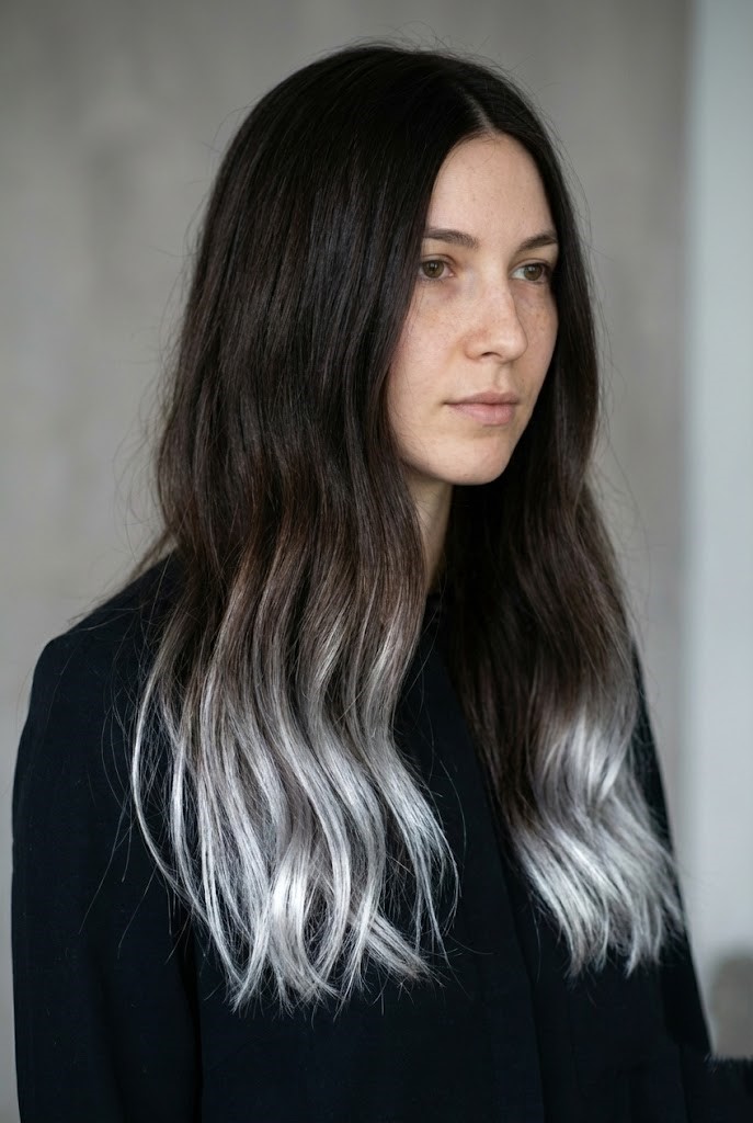 Silver-toned ends give long dark hair a bright, icy finish without coloring the upper sections. The contrast feels sleek, modern, and incredibly striking.