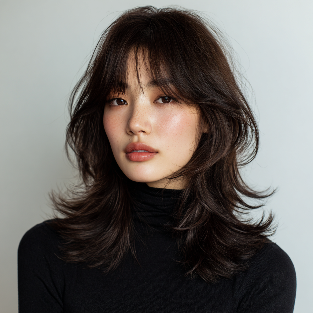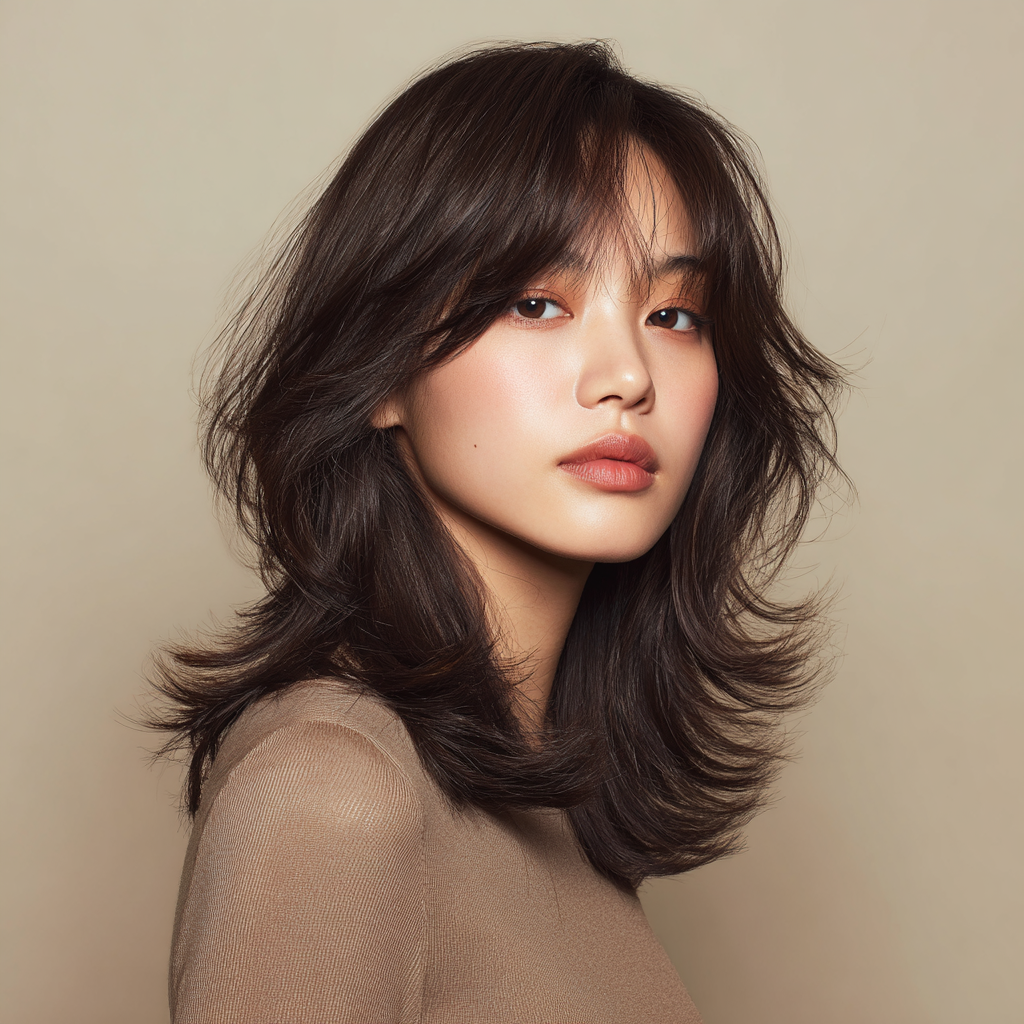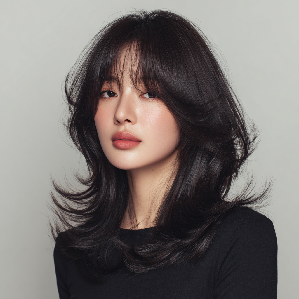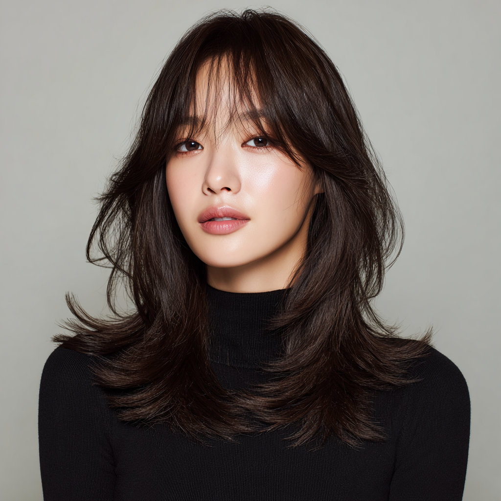The Korean wolf cut is soft, airy, and perfectly balanced — a refined version of the trend that focuses on gentle layers and natural flow. It frames the face beautifully with wispy bangs and feathered ends for a delicate, feminine finish.