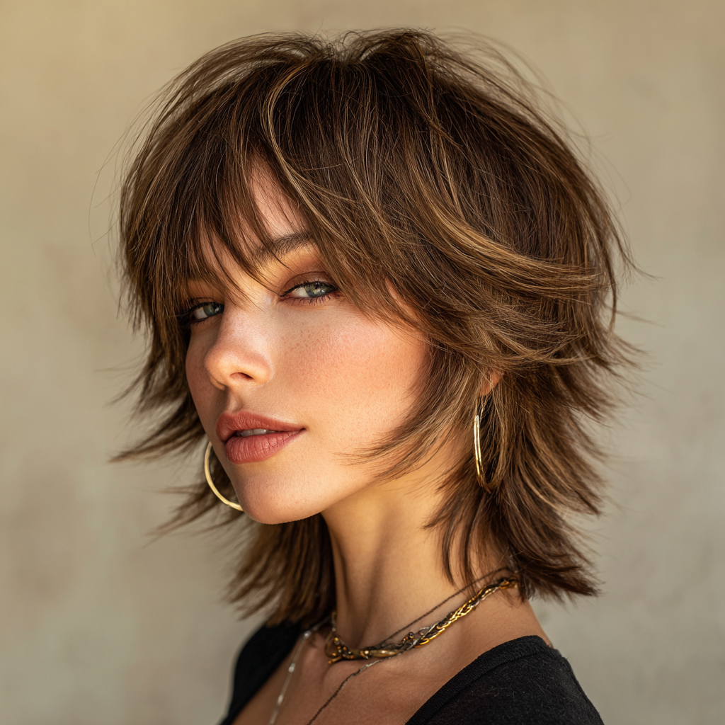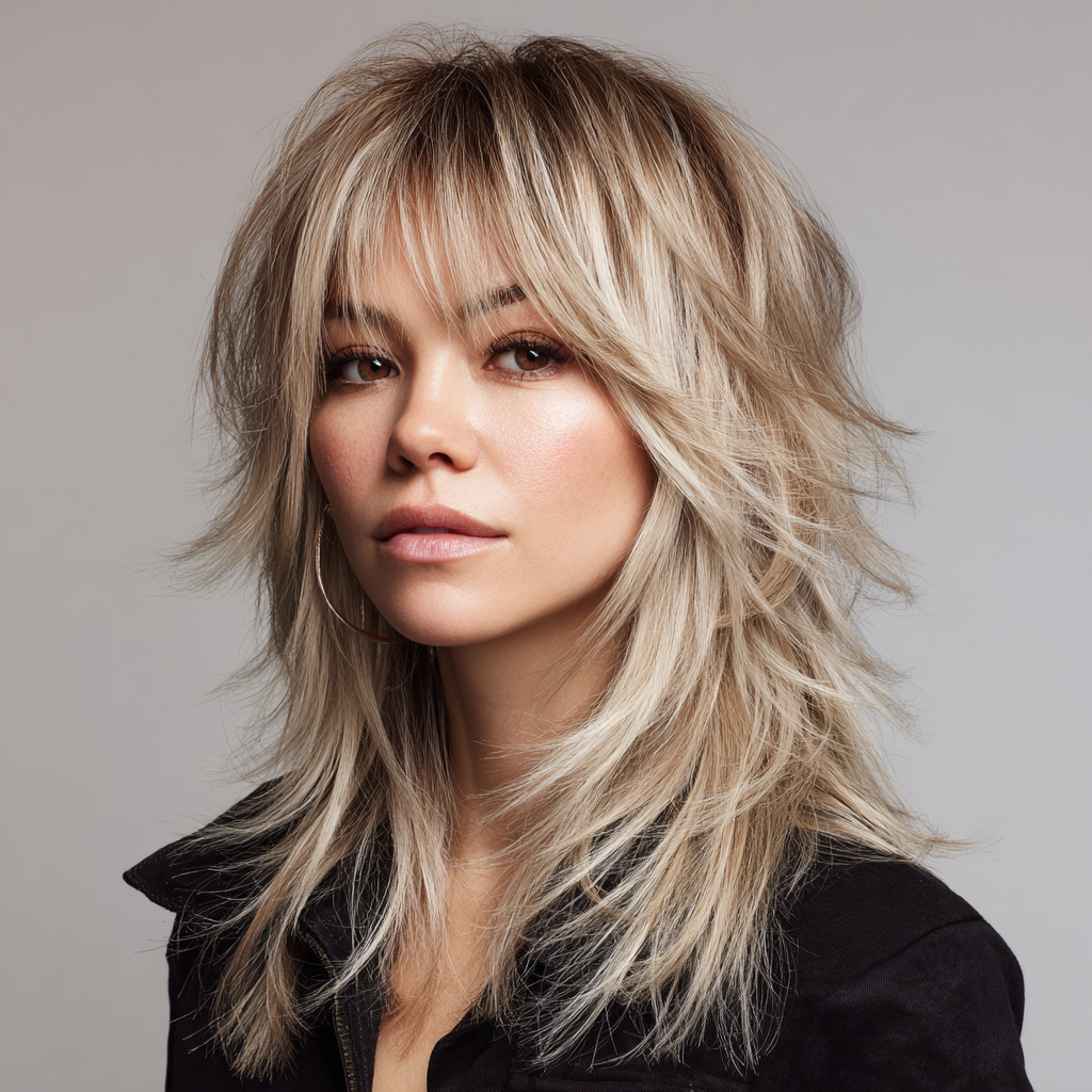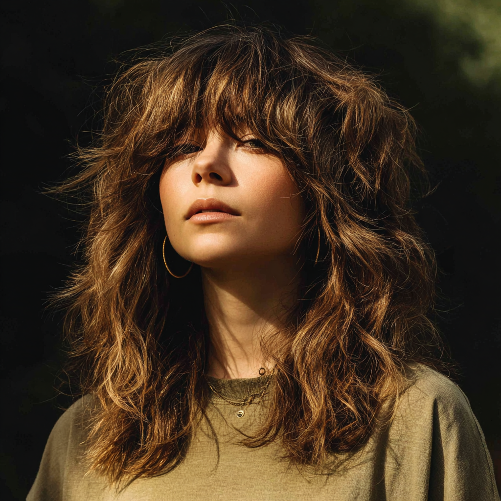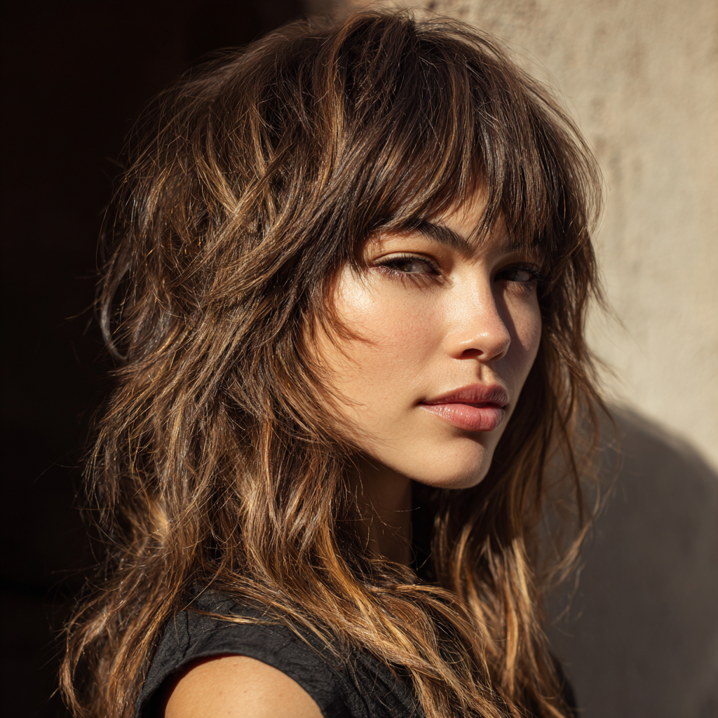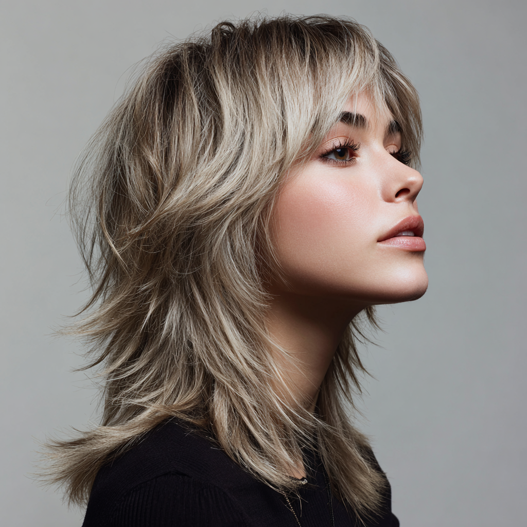 The classic wolf cut perfectly blends retro and modern energy — soft layers at the crown flow into wispy ends that create effortless texture. It’s edgy, feminine, and suits almost any hair type or length.