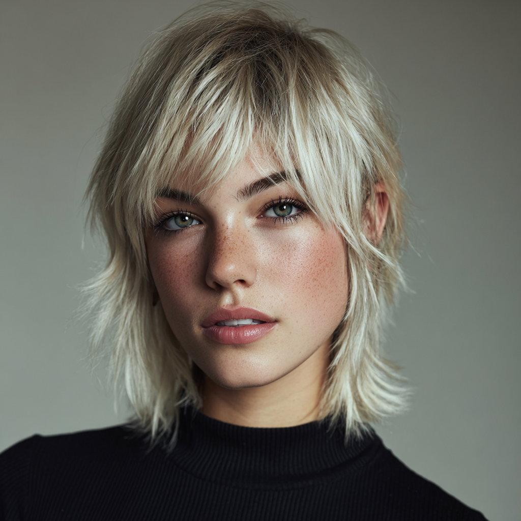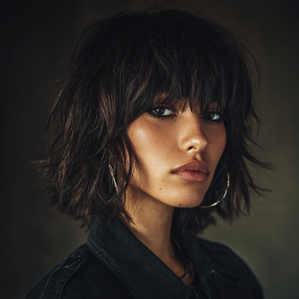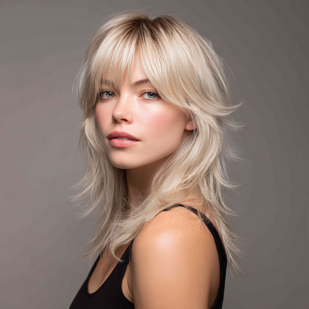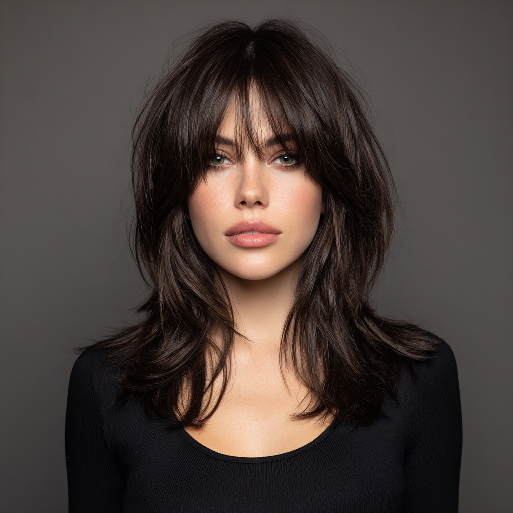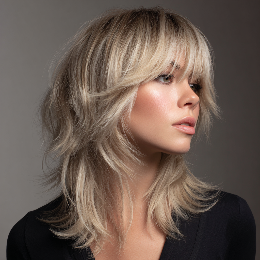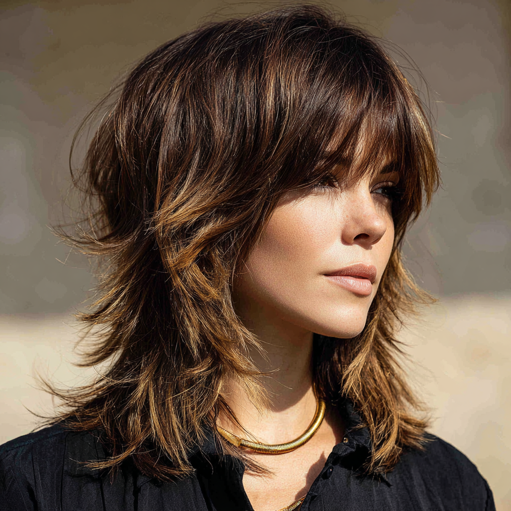 The classic wolf cut perfectly blends retro and modern energy — soft layers at the crown flow into wispy ends that create effortless texture. It’s edgy, feminine, and suits almost any hair type or length.
